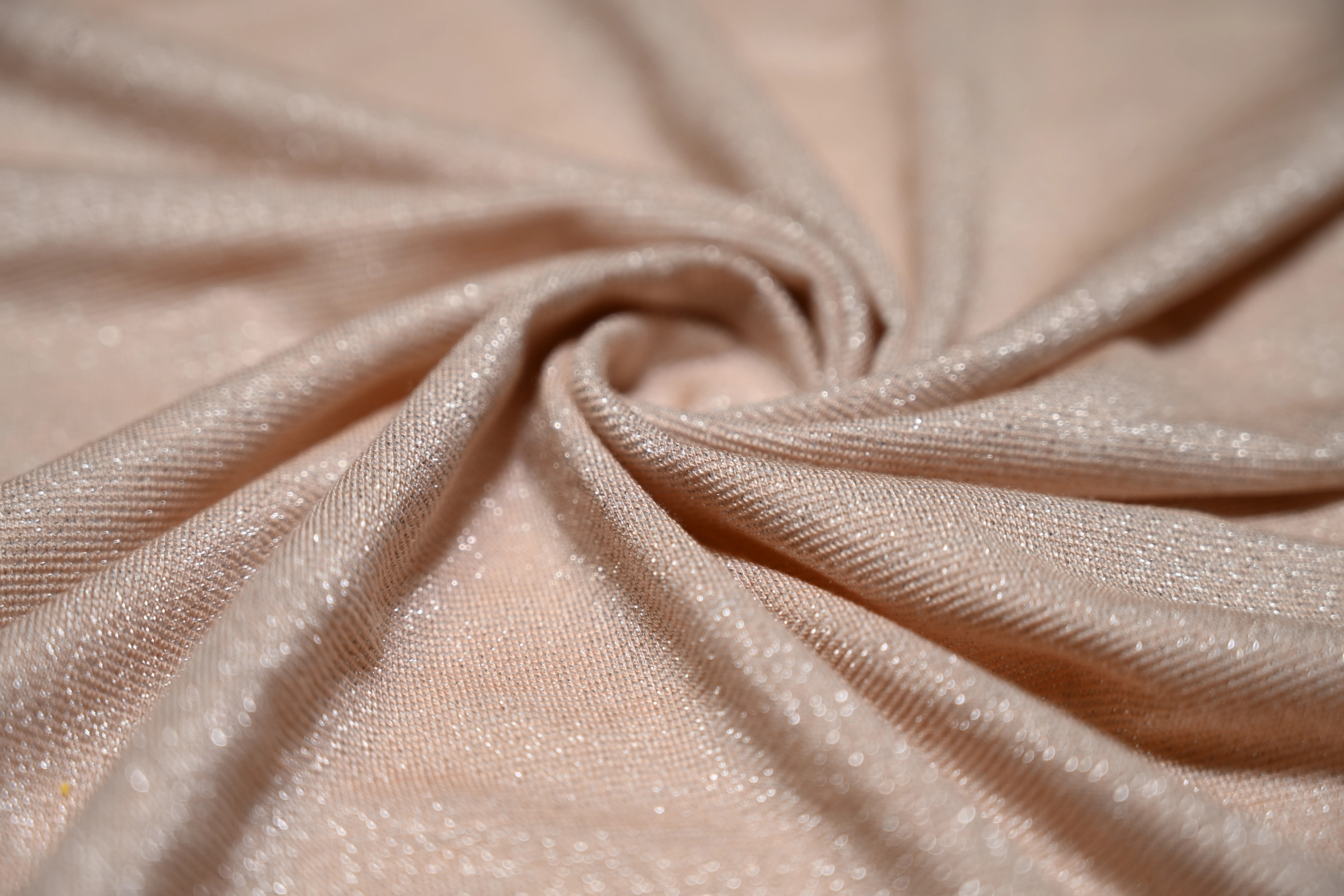 Metallic knit fabric is a type of textile made by combining traditional yarns such as polyester, viscose, or nylon with metallic fibers like lurex or silver yarn. This combination creates a fabric that offers both flexibility and a distinctive shimmering appearance.