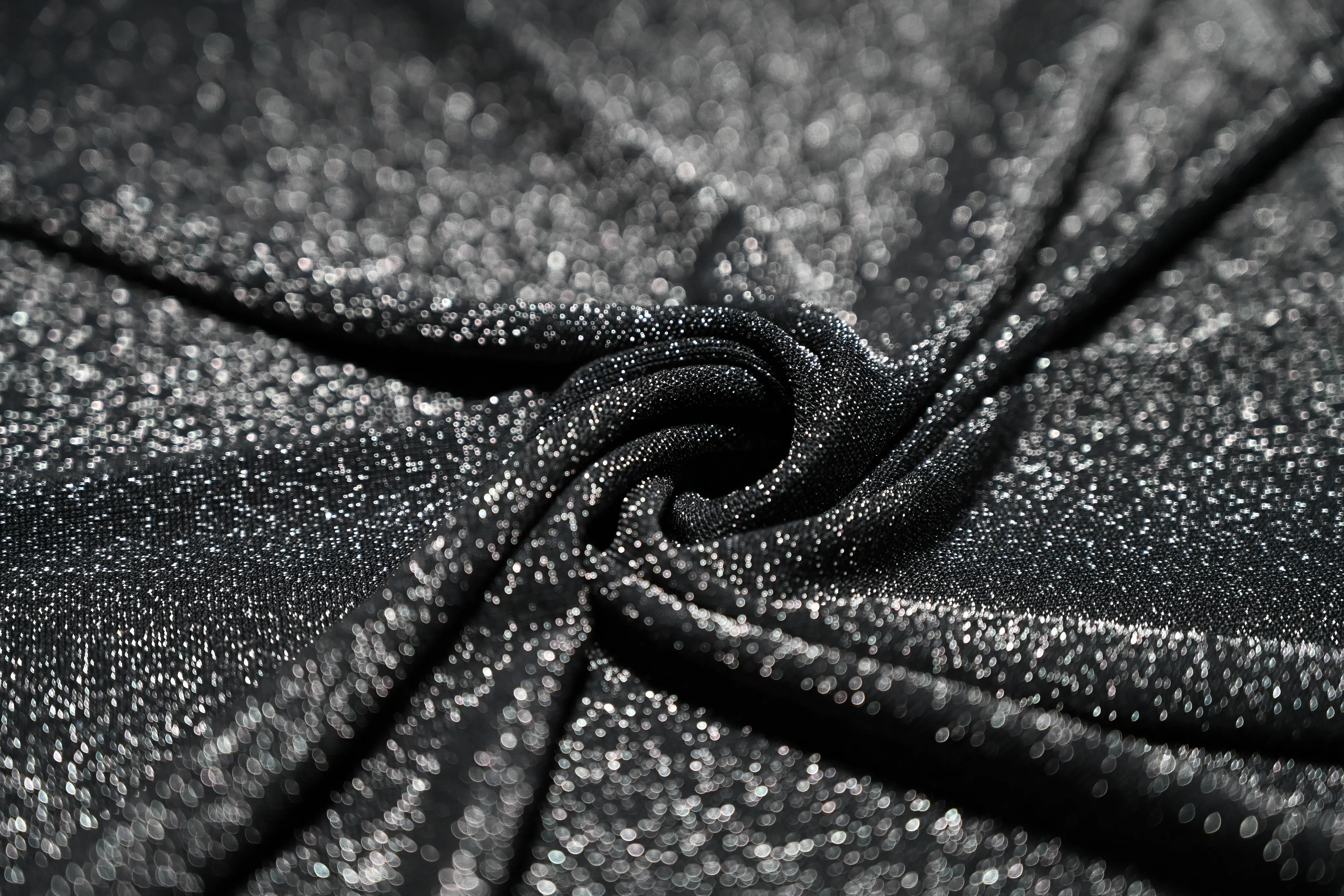 A soft viscose foundation combined with stretch and a high proportion of single-covered silver yarn for a refined, fashion-driven metallic look.